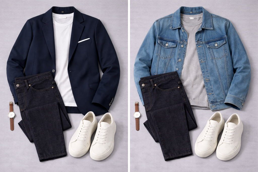 This outfit works because it balances casualness with structure. The t-shirt and jeans provide comfort and approachability. The blazer or denim jacket adds shape and signals that you put thought into your appearance. White sneakers keep things relaxed and modern. The entire combination takes two minutes to put on but looks like you care about how you present yourself.