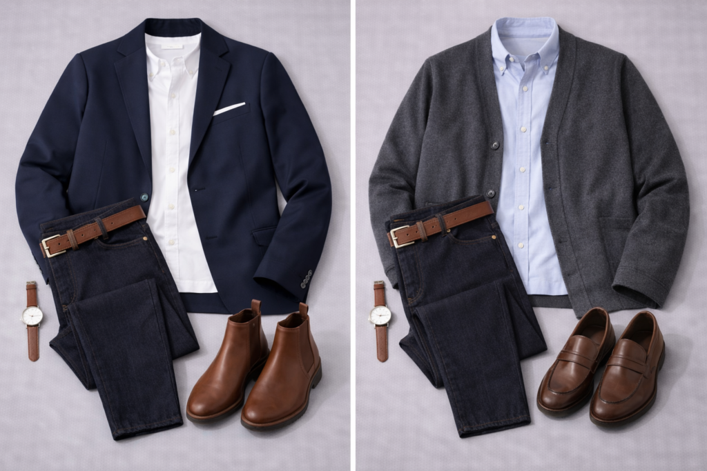 This formula is ideal for dates because it looks intentional without trying too hard. The smart-casual version—button-down, chinos, Chelsea boots, blazer or cardigan—works for 90% of date scenarios. You look like you care about your appearance without seeming like you agonized over it. Confidence matters more than complexity, and knowing your outfit works lets you focus on conversation and connection rather than wondering if you’re dressed appropriately.