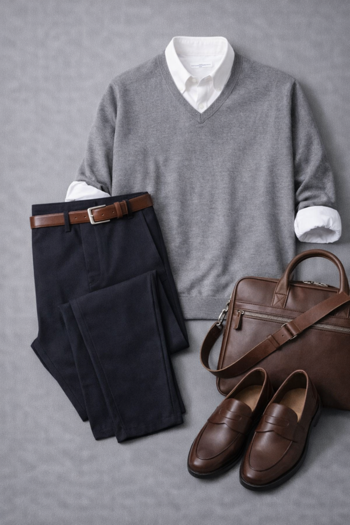 The Outfit: Navy wool trousers + white dress shirt (sleeves rolled) + grey merino V-neck sweater + brown leather belt + brown leather loafers + leather messenger bag or briefcase