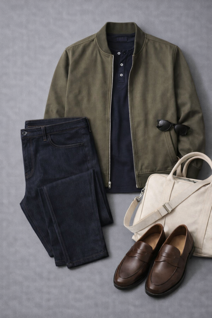 The Outfit: Dark wash straight-leg jeans + navy henley (long-sleeved) + olive bomber jacket + white leather sneakers + canvas tote or duffle bag + sunglasses