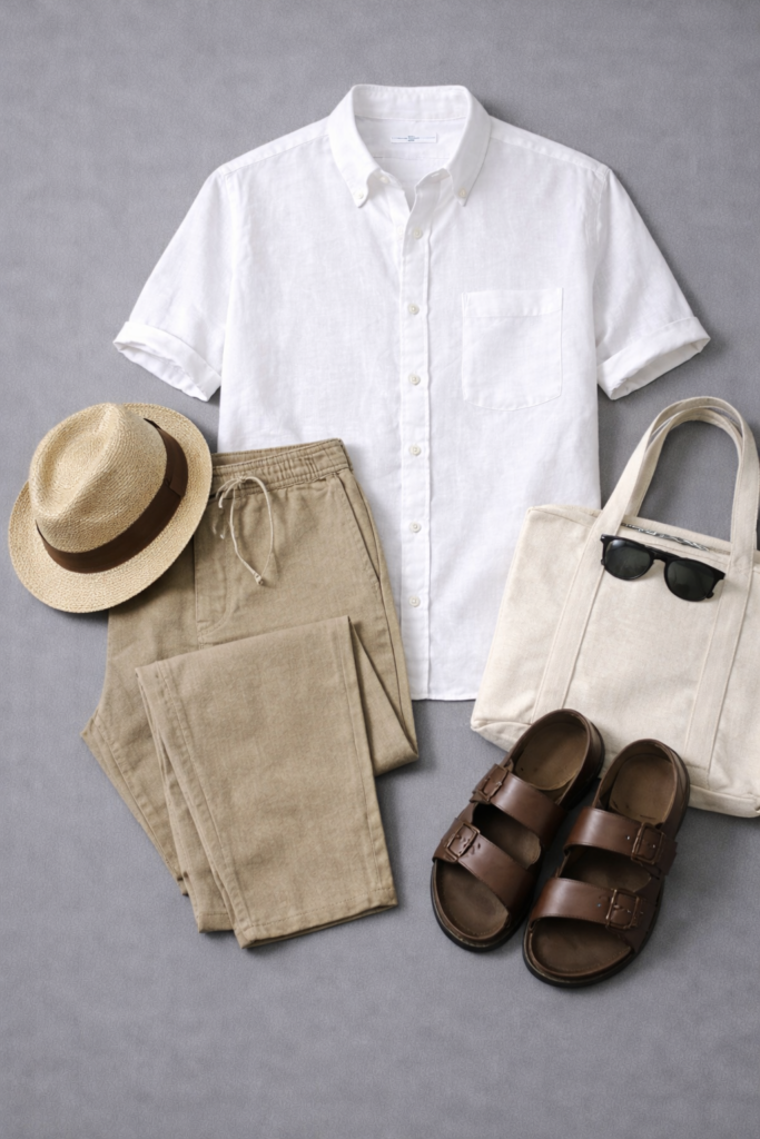 The Outfit: Khaki linen pants + white short-sleeved linen button-up + brown leather sandals (quality, not flip-flops) + straw fedora or baseball cap + linen tote bag + sunglasses