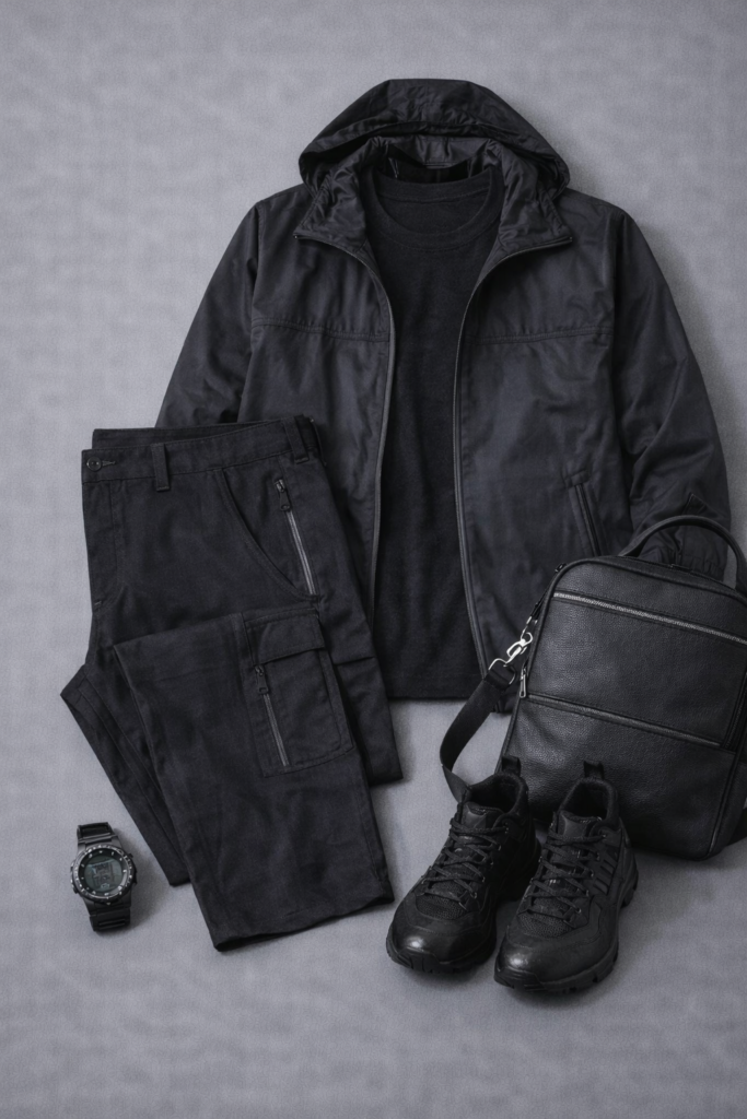 The Outfit: Black technical pants (water-resistant, multiple pockets) + black merino tee + black packable rain jacket + black trail sneakers or minimalist boots + black crossbody bag + multi-function watch