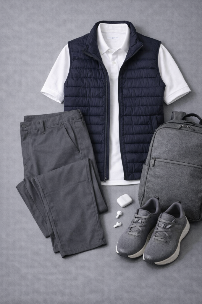 The Outfit: Grey technical chinos + white performance polo shirt + navy lightweight puffer vest + grey running shoes (minimal design) + backpack with laptop compartment + wireless earbuds