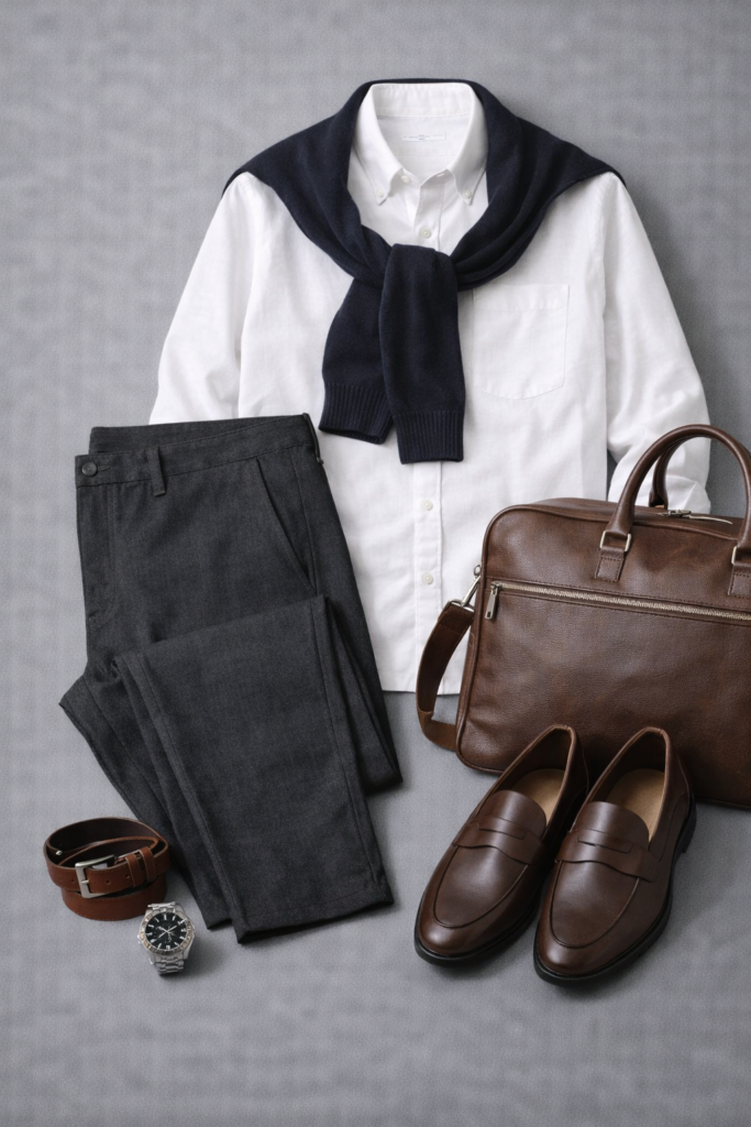 The Outfit: Charcoal wool trousers + crisp white Oxford shirt + navy cashmere sweater (tied around shoulders or worn) + brown leather loafers + brown leather belt + leather duffle bag + luxury watch
